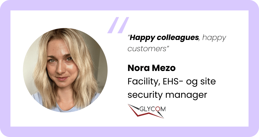 Glycom er en innovativ biotekvirksomhed, og Nora har hos Glycom rollen som facility, EHS- og site security manager. Hendes arbejdsdag er aldrig den samme, og hun må ofte håndtere uforudsete opgaver, der kræver hendes øjeblikkelige opmærksomhed. Lige netop derfor er Noras højre hånd i office management, Charm, uundværlig, når det kommer til at tage sig af de daglige opgaver og sikre, at alt kører glat.